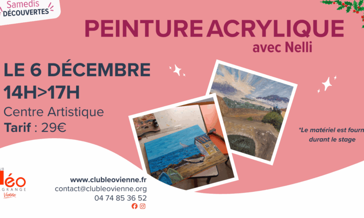 🎨 Samedi Découverte – Atelier Peinture Acrylique avec Nelli Le samedi 6 décembre, le Centre Artistique du Club Léo vous …
