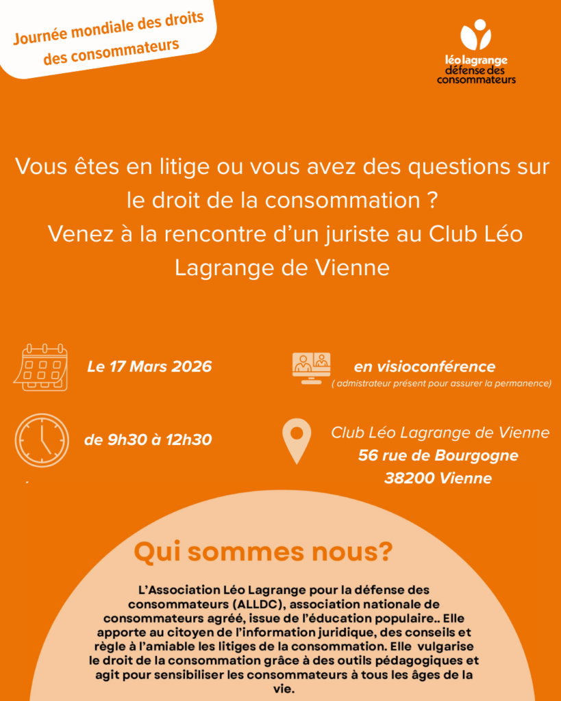 À l’occasion de la Journée mondiale des droits des consommateurs, le Club Léo Lagrange de Vienne organise une permanence d’information juridique dédiée au droit de la consommation.