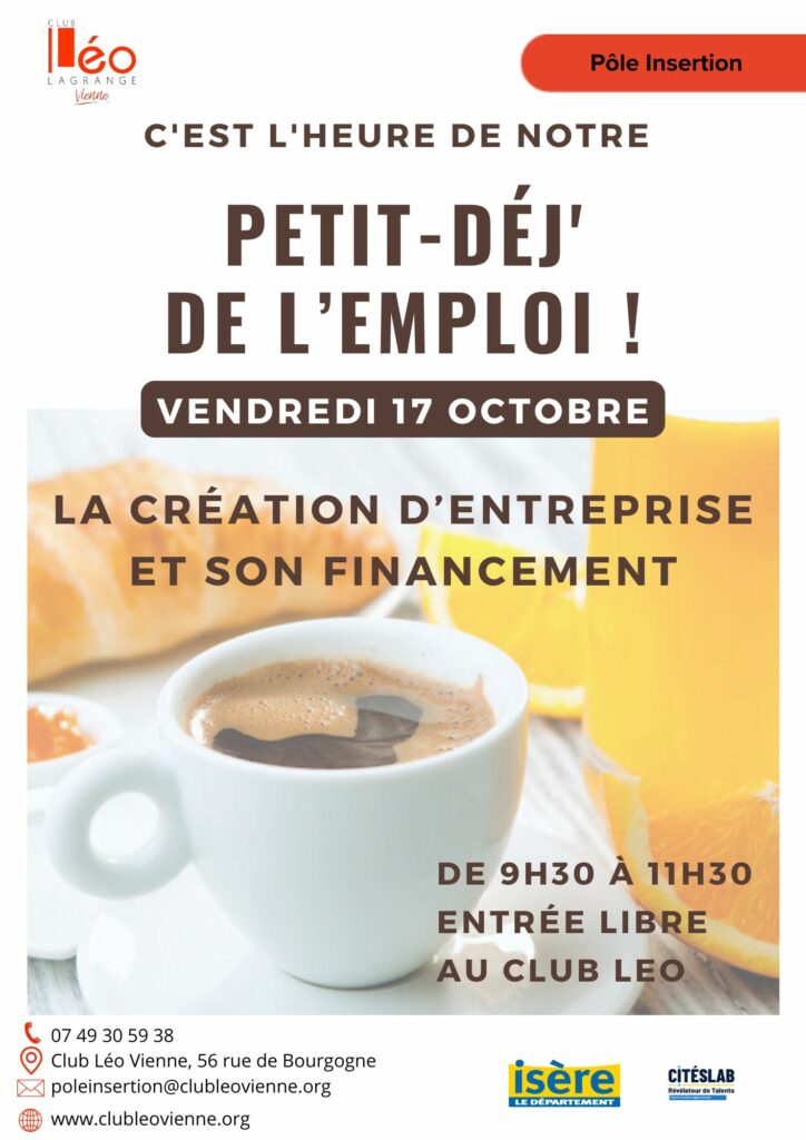 Le vendredi 17 octobre, le Club Léo Lagrange de Vienne accueillera un nouveau Petit-Déj’ de l’Emploi, consacré au thème passionnant de la création d’entreprise et son financement.
