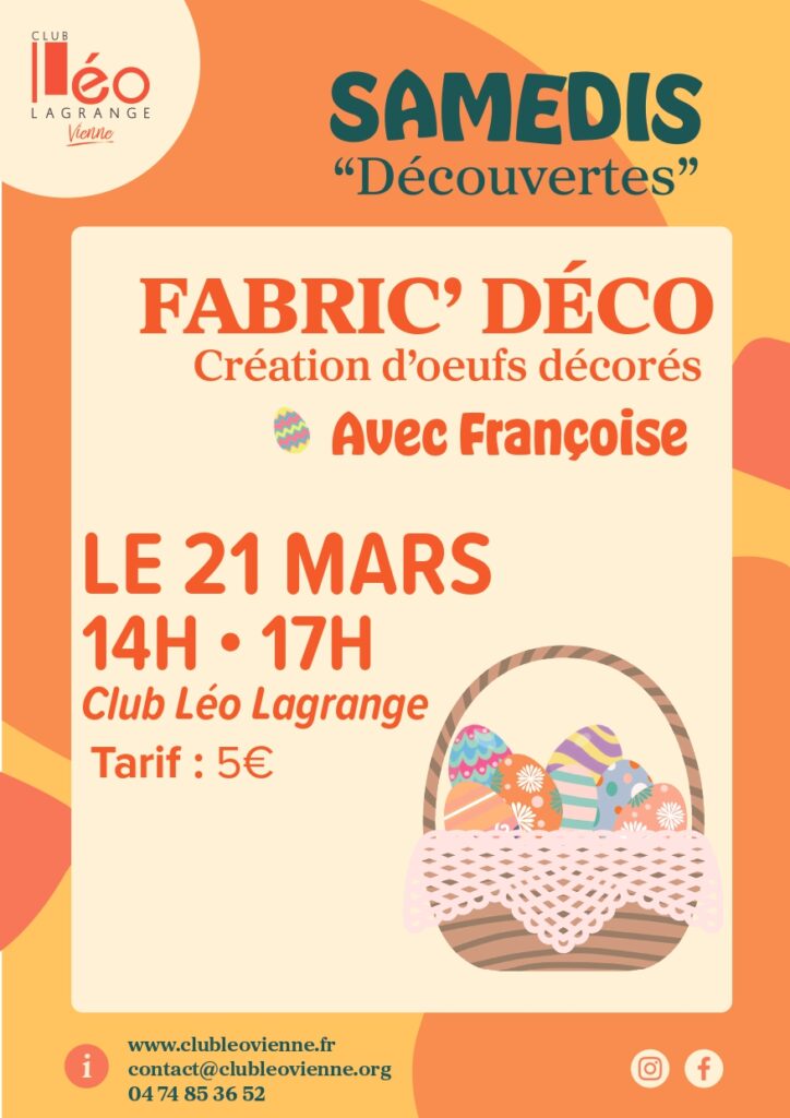 Le Club Léo Lagrange de Vienne vous invite à un Samedi Découverte Fabric’Déco, animé par Françoise, autour d’un atelier créatif et convivial : la création d’œufs décorés 🥚✨